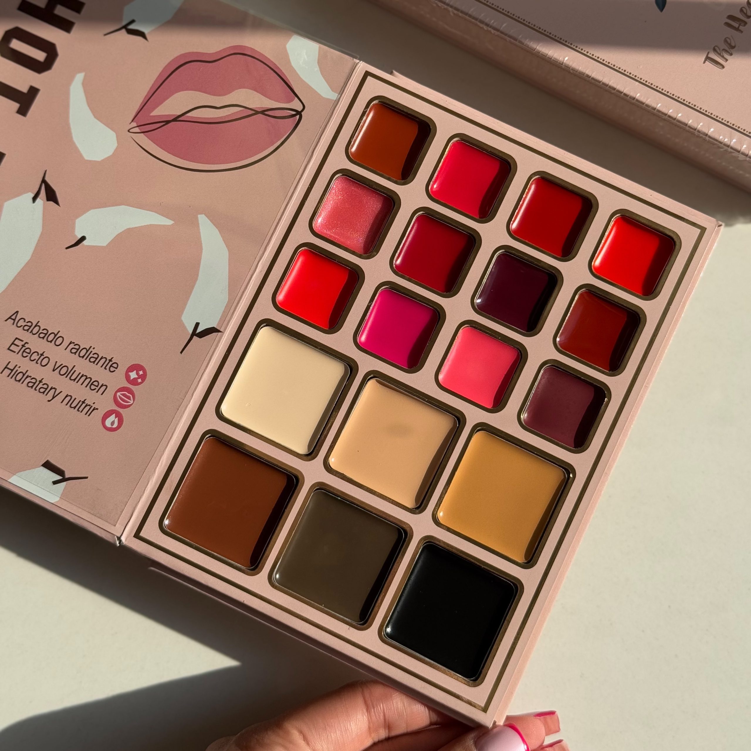 _ورق پنجم ۱۲ رنگ رژلب چرب پالتی با قابلیت ترکیب رنگ + ۳ رنگ کانسیلر چرب کرمی + ۲ رنگ کانتور و برانزر کرمی +۱رنگ چرب مشکی